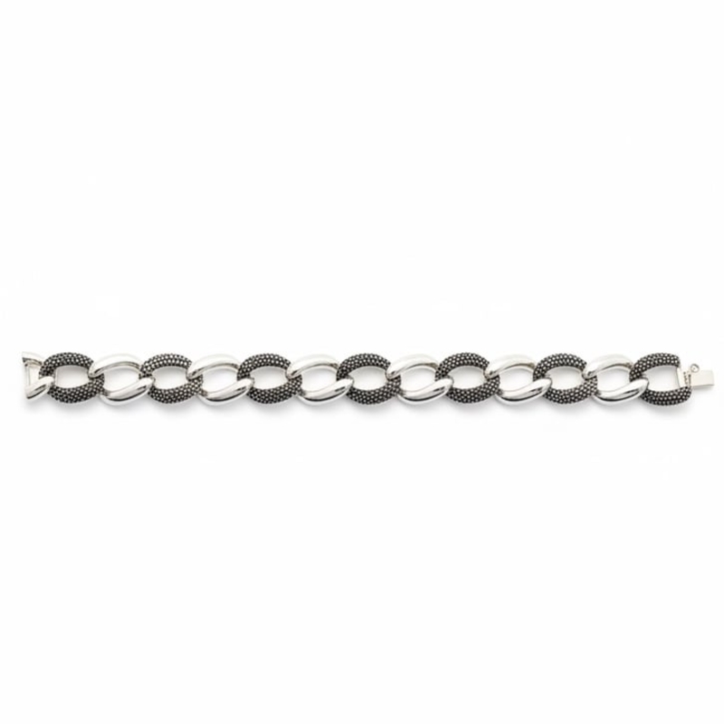 Deze zilveren armband is uitgevoerd in 1e gehalte zilver (925) met een gourmet schakel die ritmisch gladde schakels afwisselt met schakels bezet met markasiet. De armband heeft een lengte van 19 cm, circa 1 cm breed en weegt ongeveer 23,5 gram, wat zorgt voor een evenwichtige draagervaring.zilver.nl