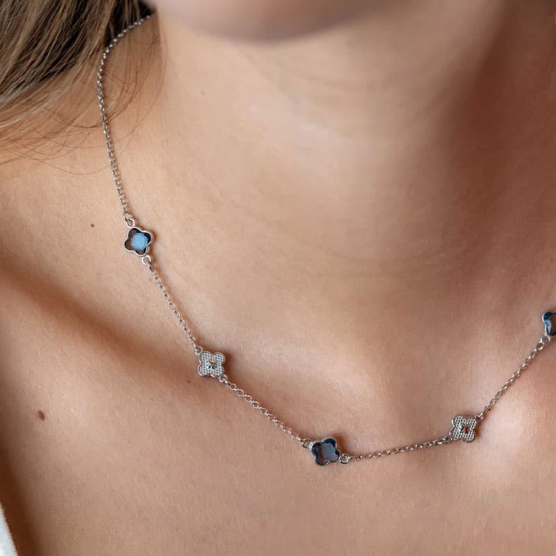 Deze zilveren schakelketting is uitgevoerd met vijf klavervormige elementen die gelijkmatig over de hals verdeeld zijn. Het sieraad is vervaardigd van eerste gehalte zilver (925) en voorzien van een extra rodium laag voor een langdurige glans. De ketting bevat drie blauwe klavers van kleursteen en twee zilveren klavers met een variabele lengte tussen 40 en 45 centimeter.