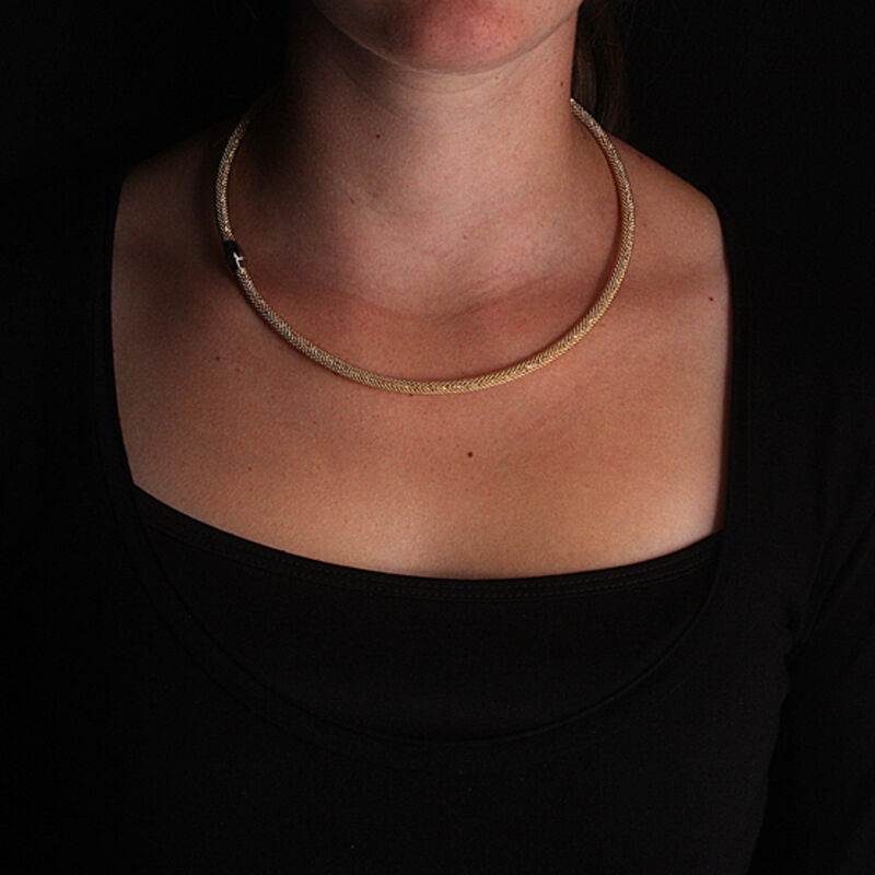 Goudverguld zilveren collier met magnetische sluiting, gemakkelijk om te doen en door de strakke vorm blijft het zilveren collier mooi zitten. Het collier is 43 cm lang, 24 gram.