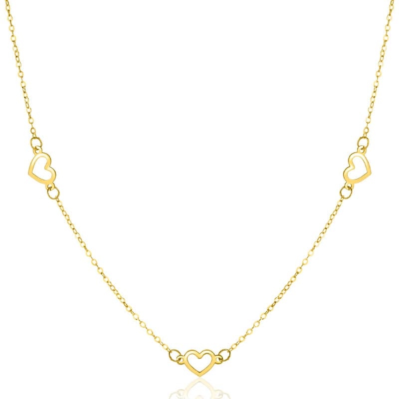 Deze 14 karaat gouden ketting van Zinzi bestaat uit subtiele ankerschakels die zijn voorzien van vijf open hartjes met een diameter van 5 mm. Het sieraad is volledig vervaardigd uit 585 goud en heeft een lengte die verstelbaar is tussen de 42 en 45 centimeter. Door de gelijkmatige verdeling van de hartvormige elementen in de fijne schakels ontstaat een rustig en evenwichtig geheel.