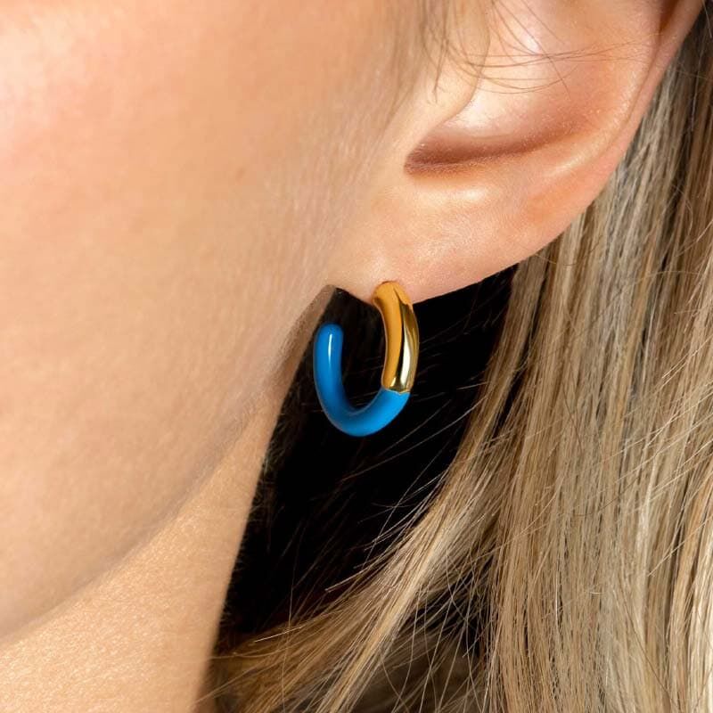 De combinatie van warm geelgoud met helder blauw maakt deze steekcreolen net even anders dan standaard gouden sieraden. Perfect om jouw outfit iets extra’s te geven zonder overdreven te doen.